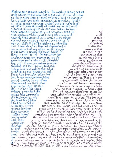 And here then is the paradox that takes some lifetimes to ever understand—that when we open ourselves wide enough to take in all the gaps, the unfinished places, the ways we are torn open and left incomplete, when the hollowed spaces in ourselves, in our hearts, in our lives are allowed to remain unfilled, when our flaws, all of our fuck-ups and every imperfection is gently held open, then we find that then, without striving or struggle, we are truly whole.